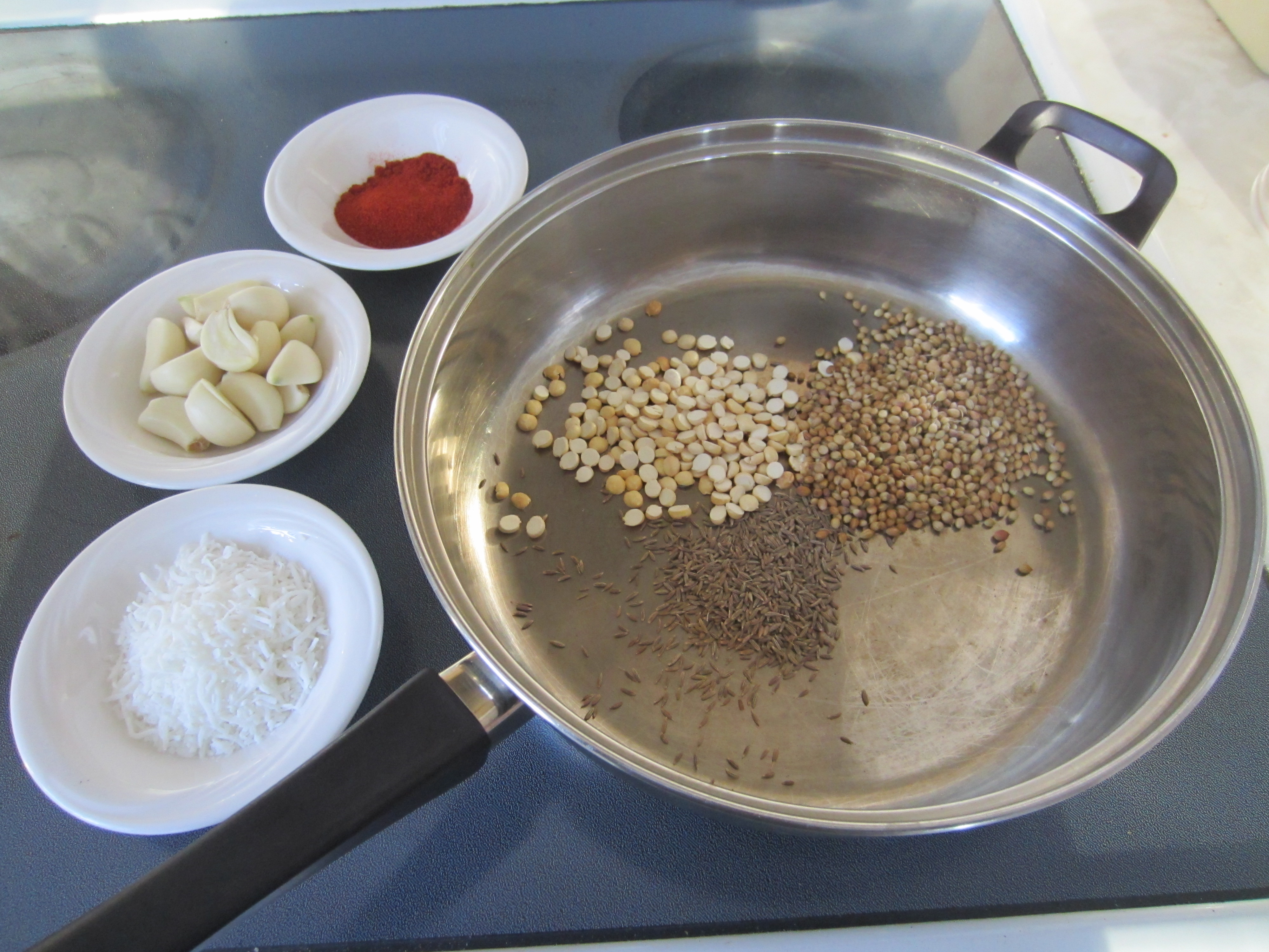 1. Roast coriander, cumin, split gram in a dry pan until you can smell the aroma. Add shredded coconut at the end and remove from the heat. Remove the roasted mixture in a plate.
