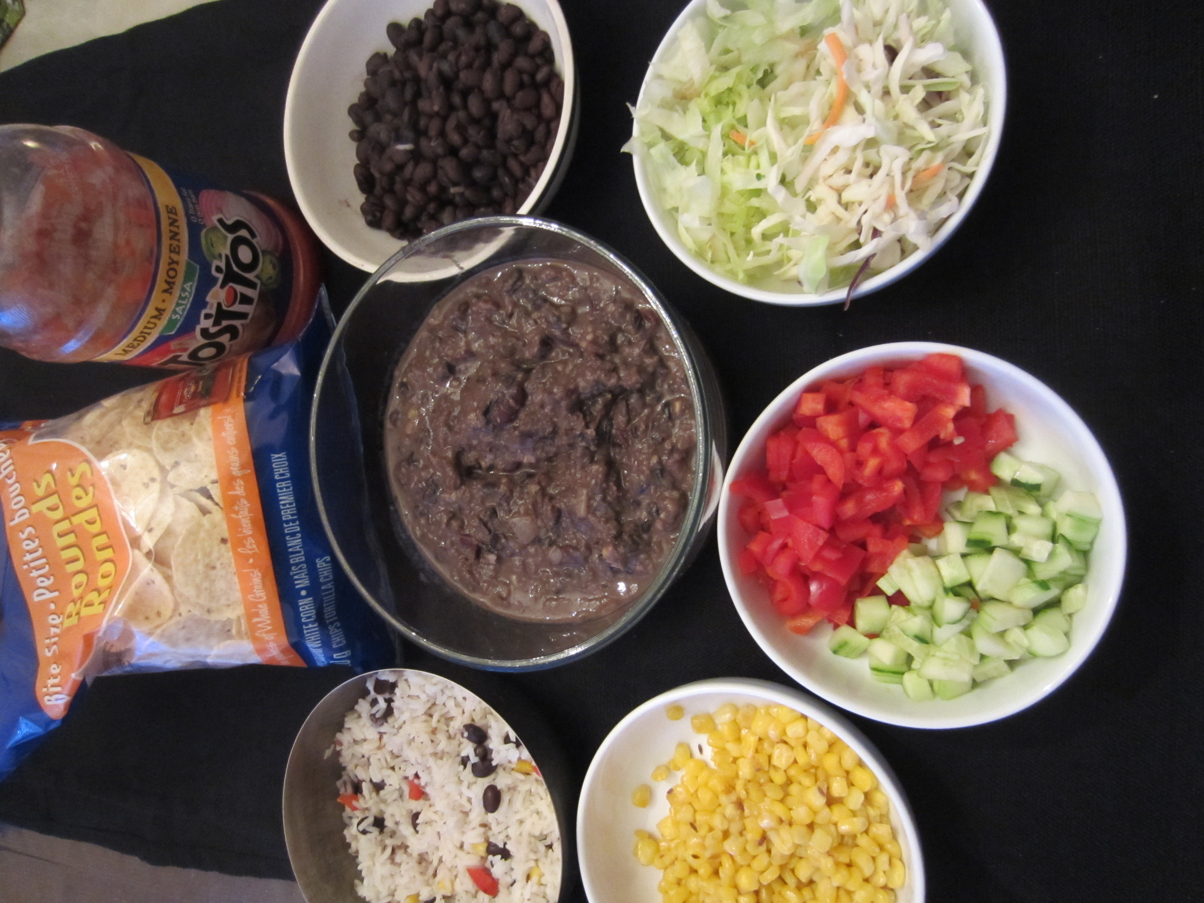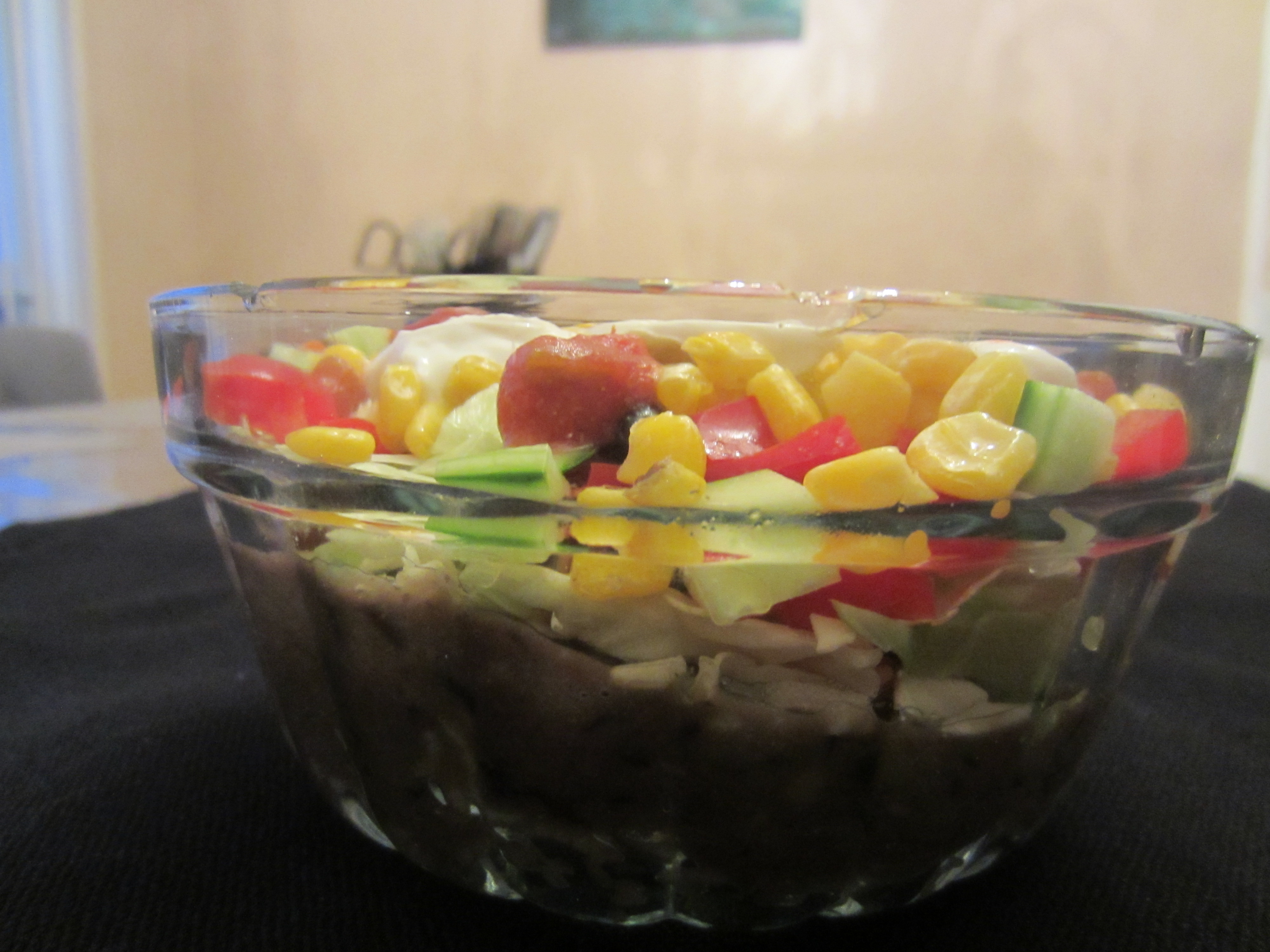 4. In bowl, first add tortilla chips then cooked rice, bean paste, sautéed corn, vegetables, cooked black beans, salsa, sour cream and cheese