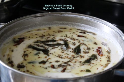 Presenting the dish which is loved by all my family and friends. Whenever I have guest over for dinner they all love it :). Kadhi is made in different parts of India but Gujarati makes it sweet and tangy. You can enjoy this kadhi with roti or rice.