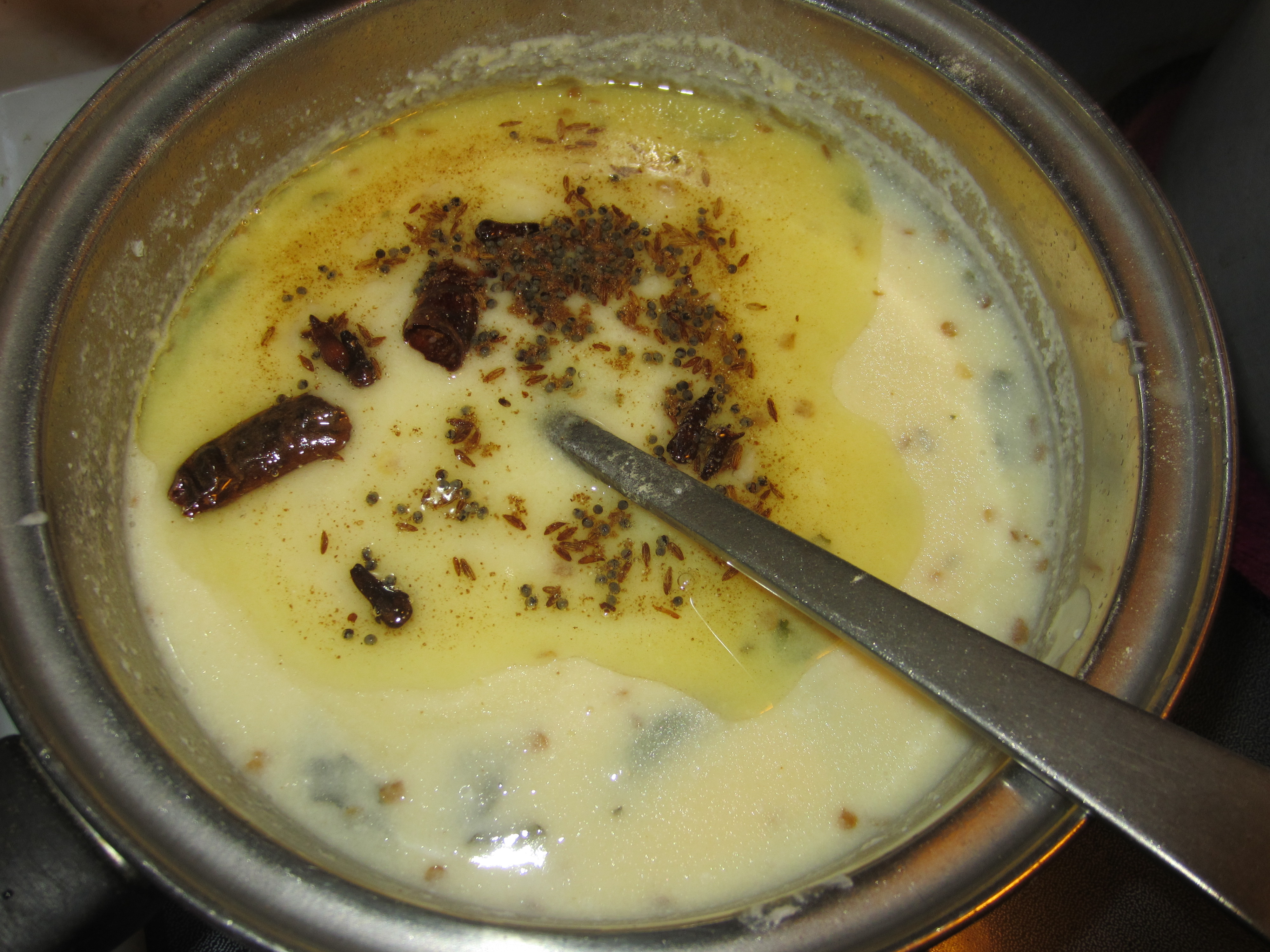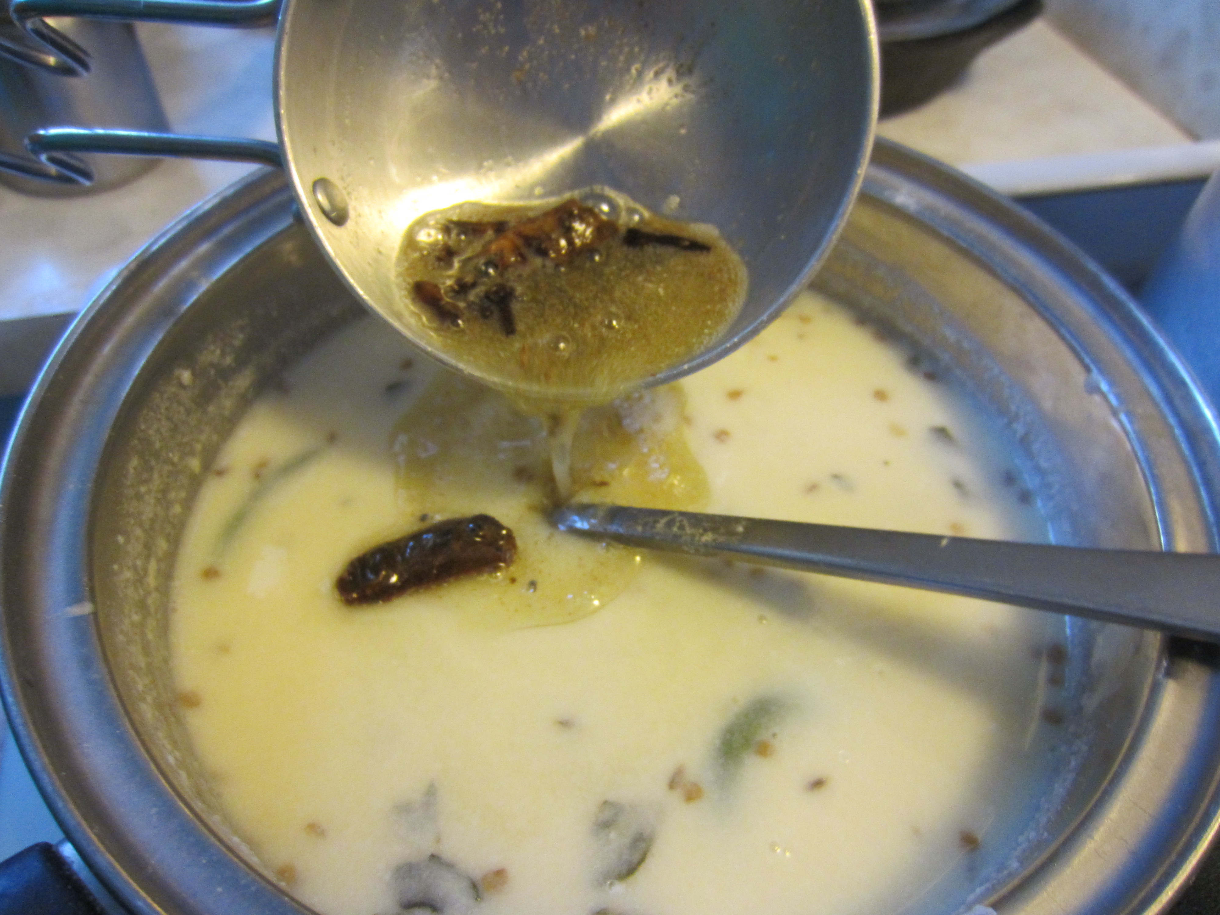 5. When mustard seeds splutter pour this mixture into the kadhi.