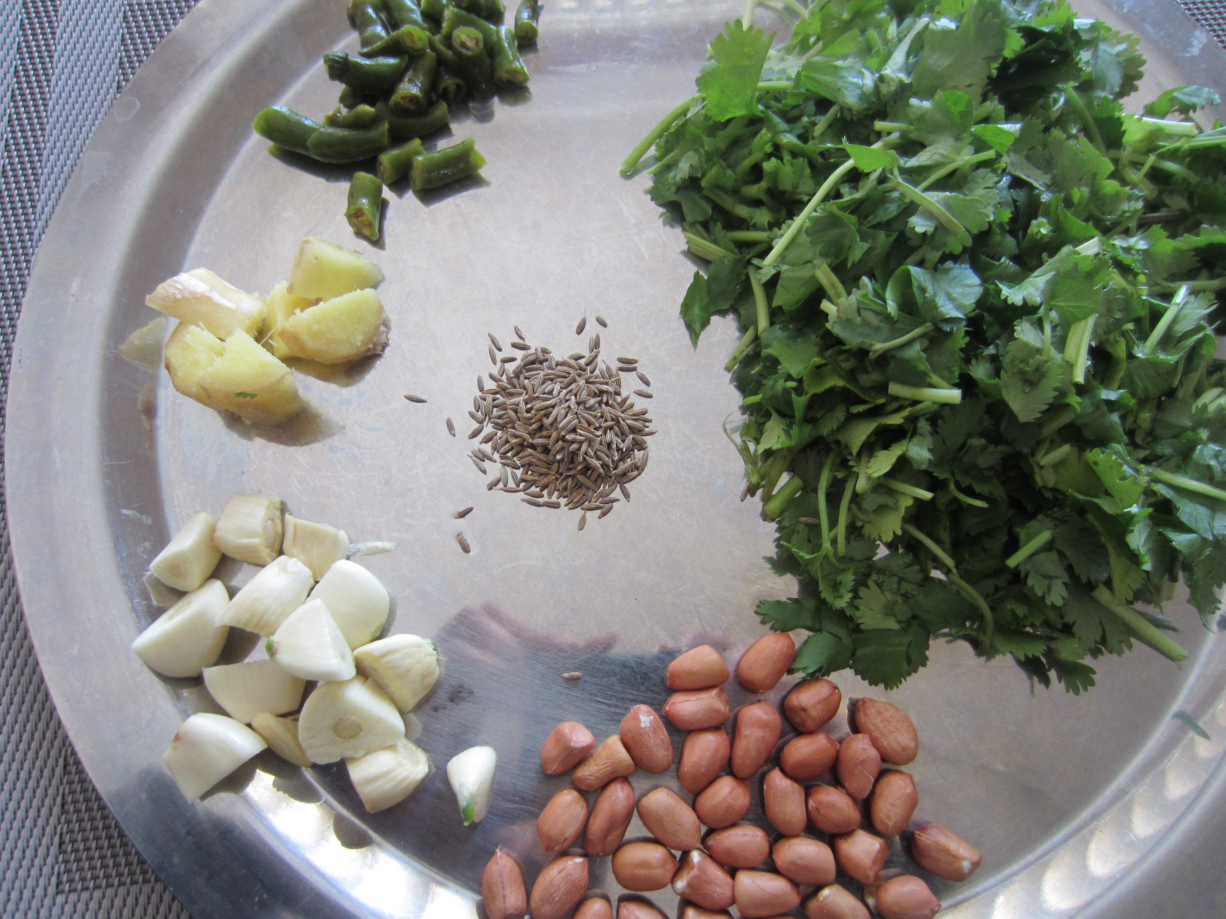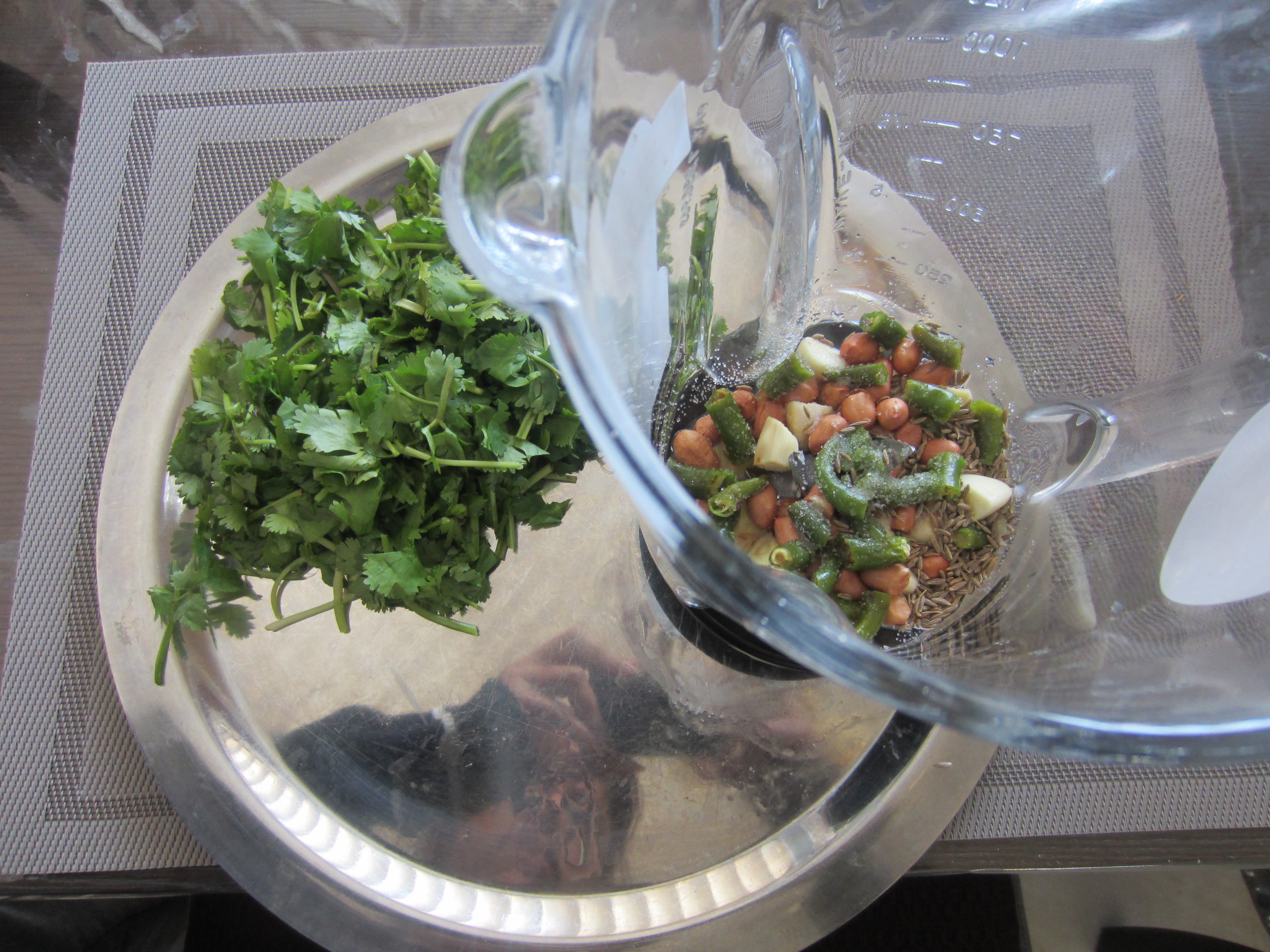 2. In a blender/mixer, fist grind garlic, ginger, green chilies, cumin seeds and peanuts with 1/4 cup of water and make slightly smooth paste.