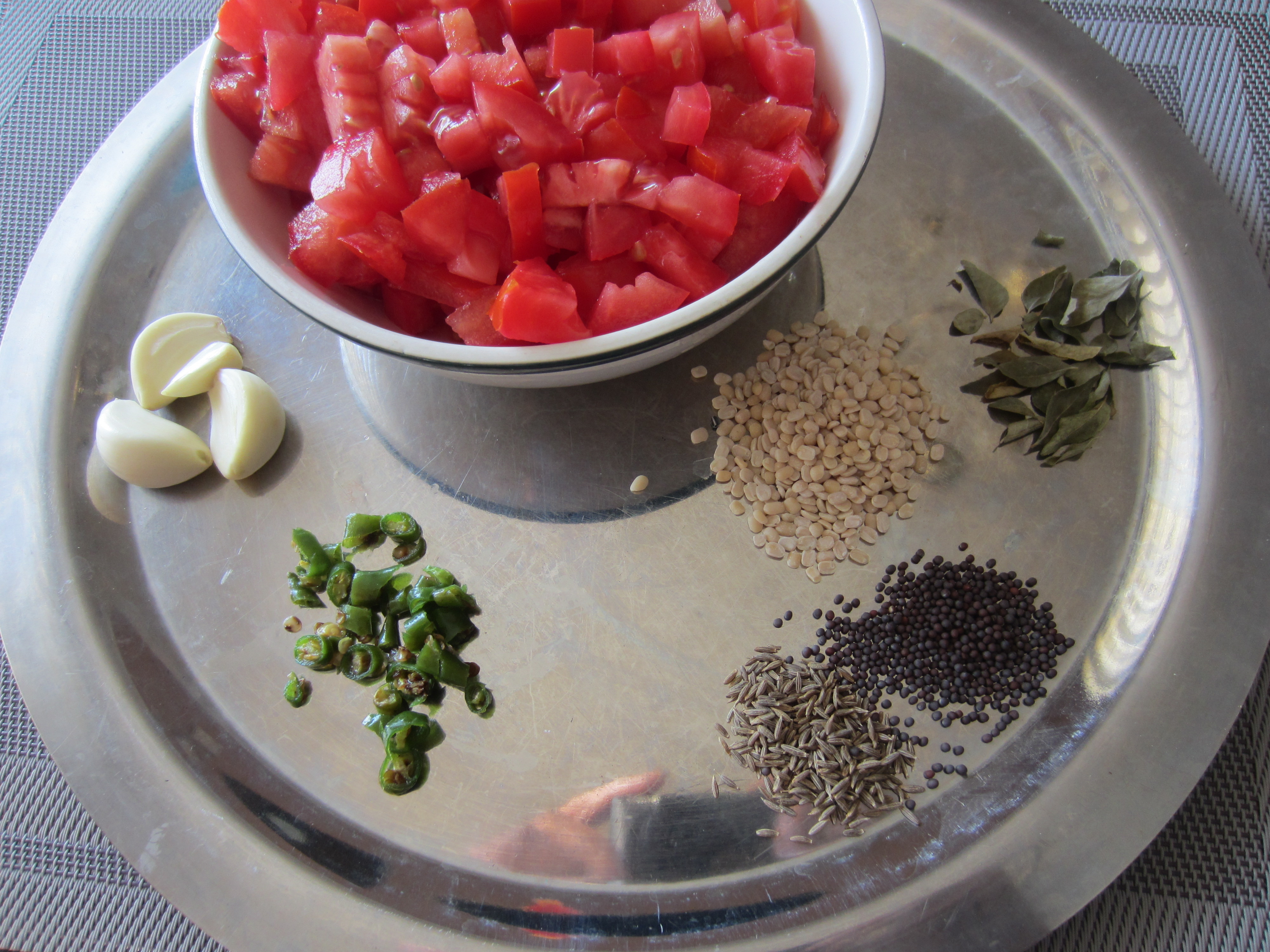 1. In pan, heat 2 tbsp oil. Add cumin seeds, mustard seeds, urad dal. When mustard seeds starts spluttering add pinch of asafoetida, curry leaves and green chilies, saute for a minute. Now add chopped tomato and grated garlic and cook until tomato are soft and become like a thick paste for around 4-5 minutes.
