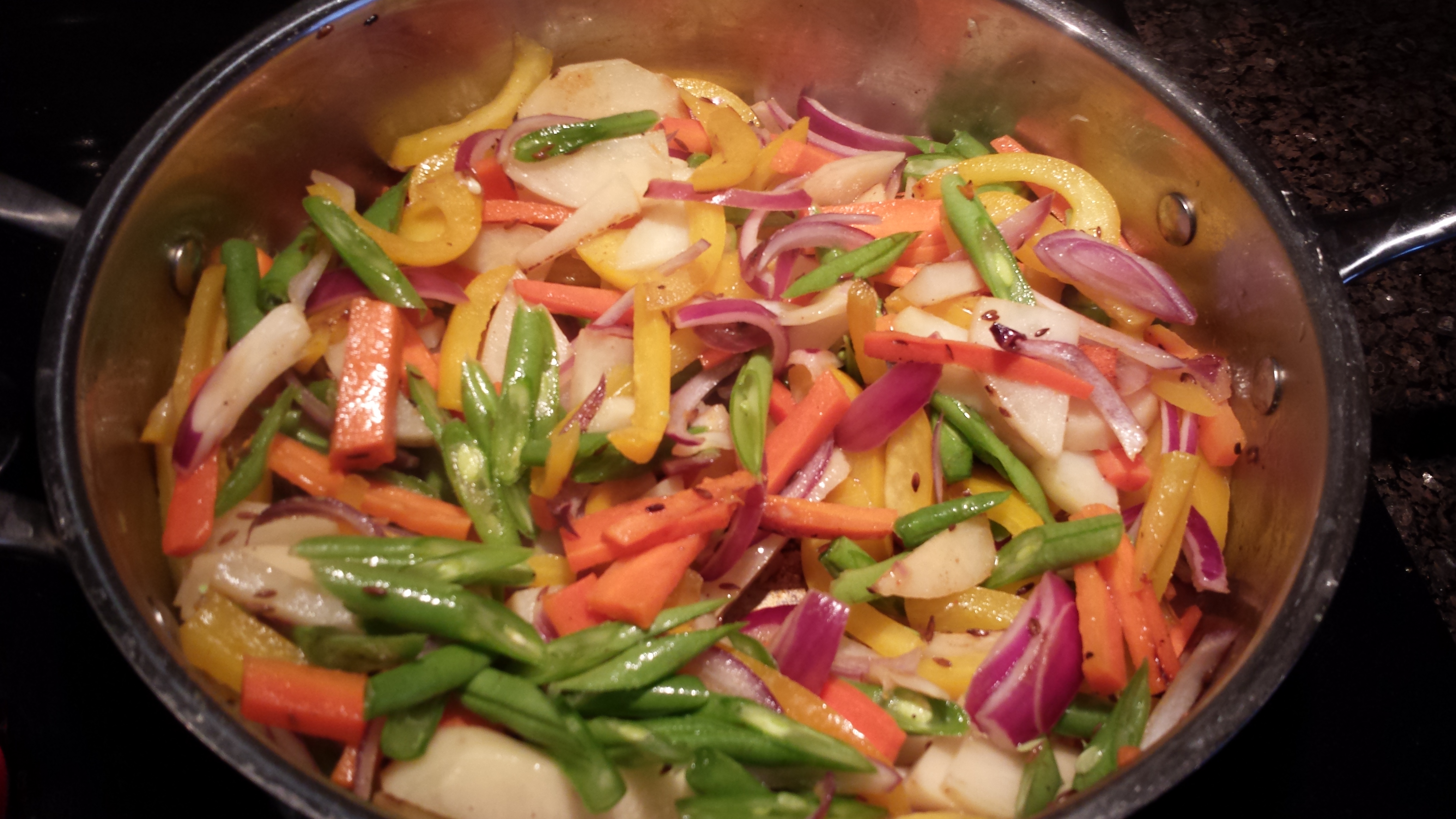 1. In a large non-stick pan, heat oil on medium heat. Add cumin seeds to the oil. When the seeds start to pop, add all the vegetables and saute on medium heat for 5 mins. Reduce the heat to a low setting. Add salt to the mixture and cover, allowing the vegetables to cook slowly. Stir the mixture every few minutes.