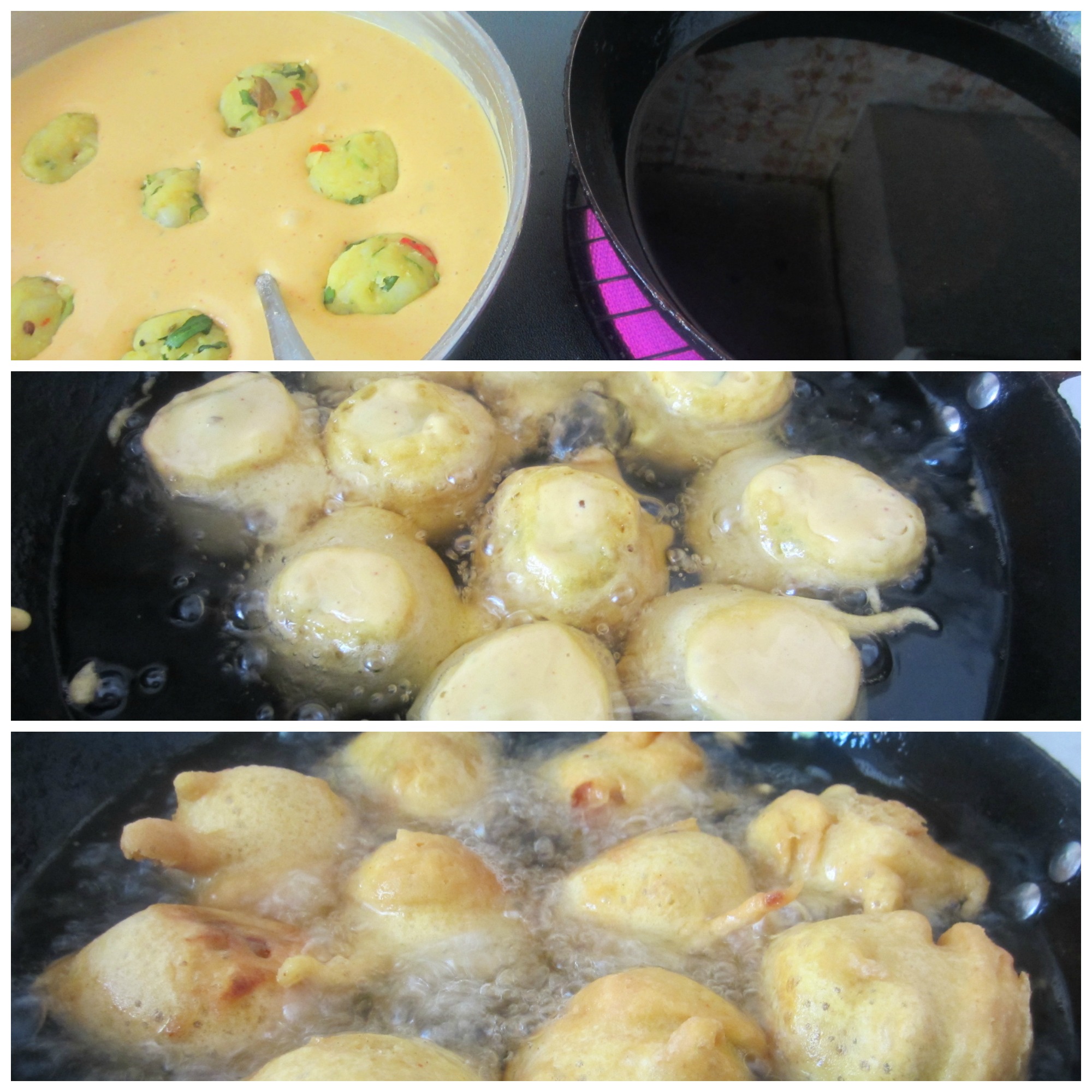 7. Heat oil in frying pan. Drop 5-7 potato vada in batter, cover with batter from all the sides and slowly drop one vada at a time in frying pan. Fry vada until it is golden brown from all the side.