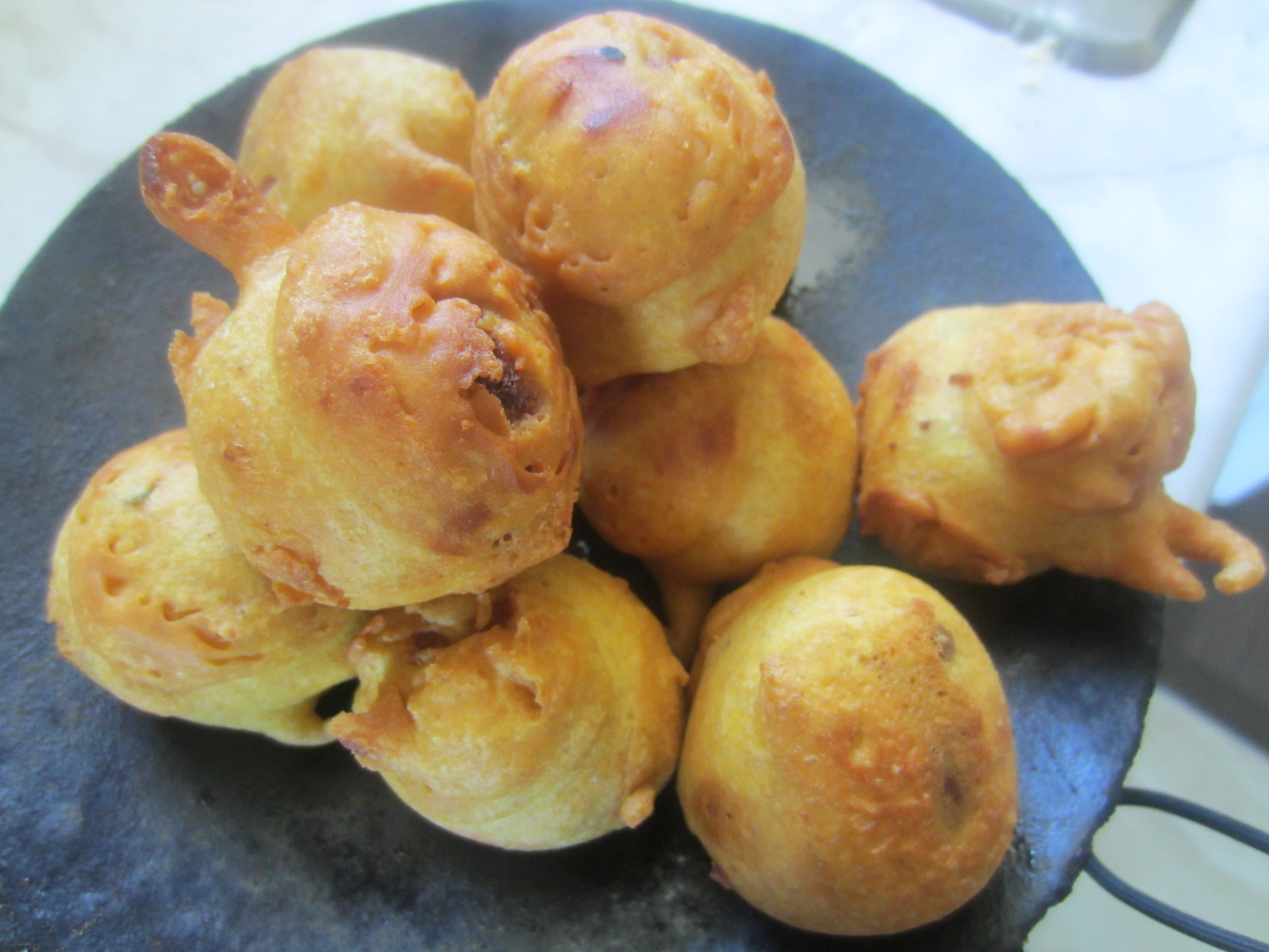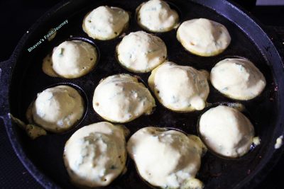 You can also make healthy version using paniyaram (appe) pan without loosing the taste. Keep the batter slightly thick so it sticks to vada. Prepare slightly small vada to fit in appe pan. Heat appe pan. Drop 1/2 tsp oil in each groove, then add vada coated in thick besan batter. Cook vada on medium heat. When vadas are slightly done at the bottom, move it and add 1/2 tsp oil again. Cook from all sides until it’s done.