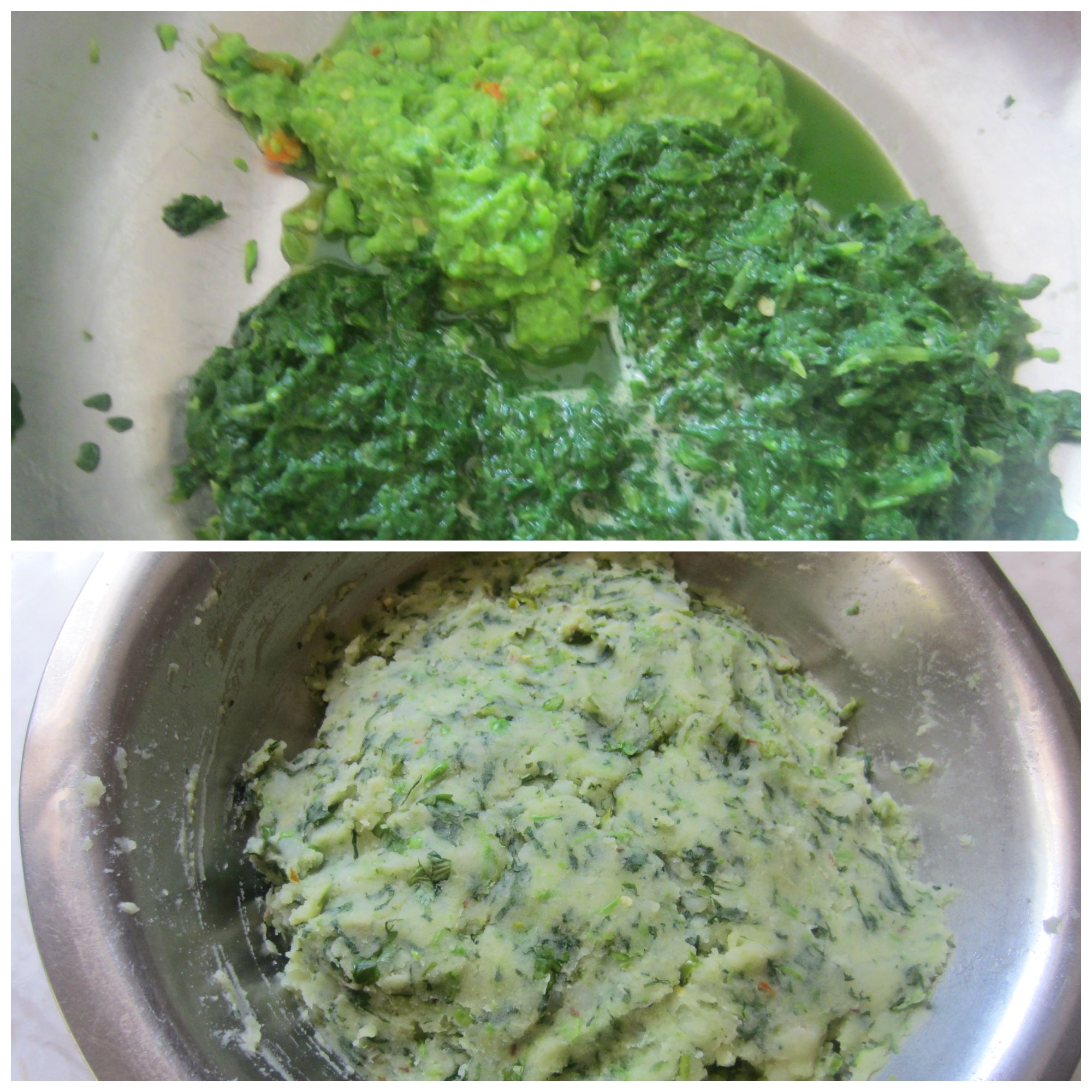 4. Mix spinach and green peas paste in to mashed potato. Add cumin powder, 1 tbsp lemon juice, salt and chopped coriander also to this mixture and mix well.