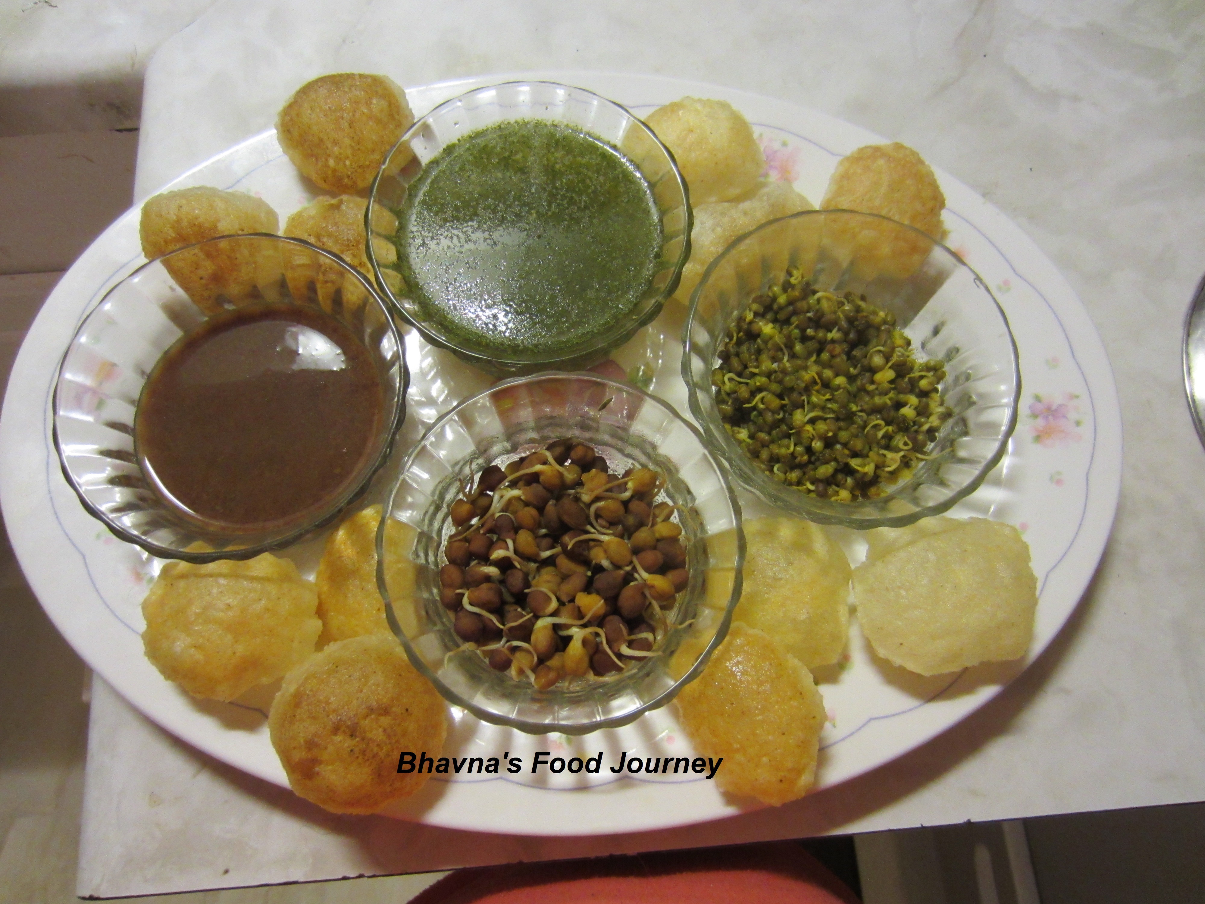 8. Serve this puris with pani (spicy water), yellow peas, cooked with salt and turmeric powder, boiled brown sprouted chana and dates-tamarind chutney