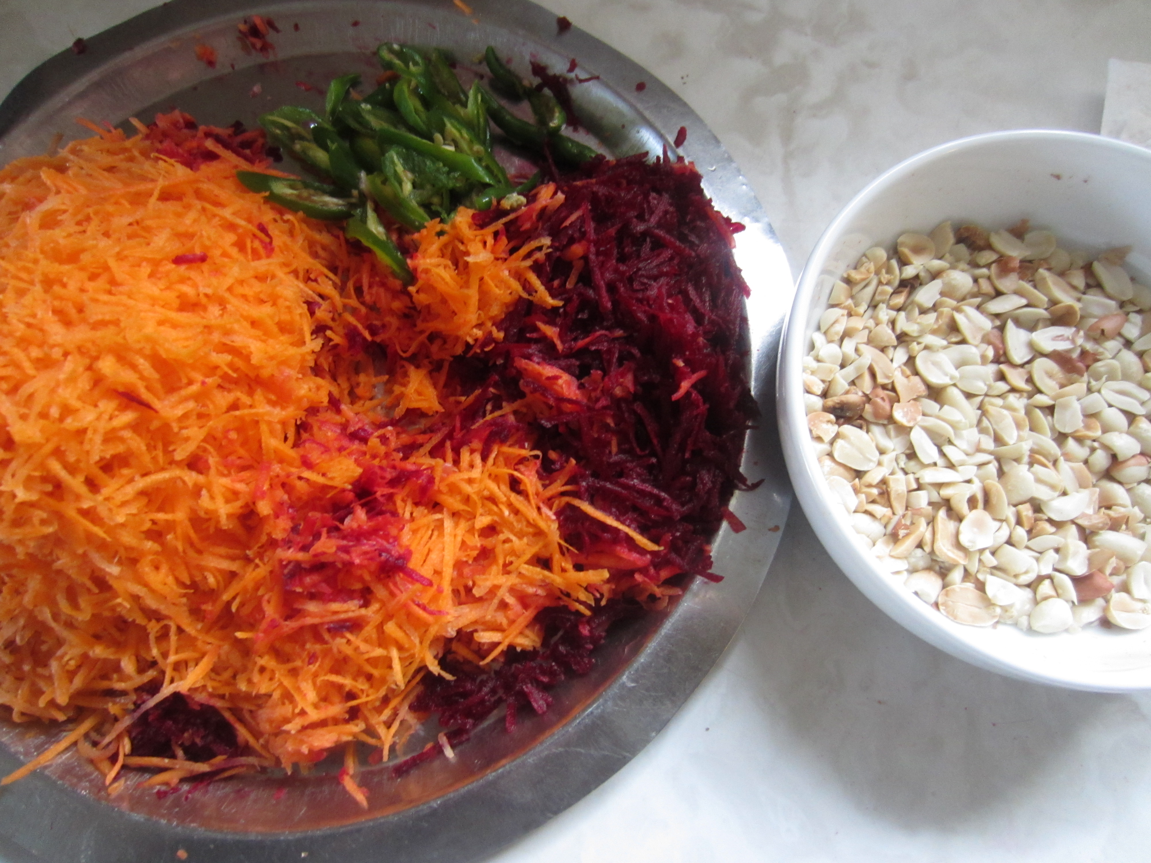 1. Grate carrots and beets. Thinly slice green chilies. Dry roast peanuts, remove skin and crush slightly.