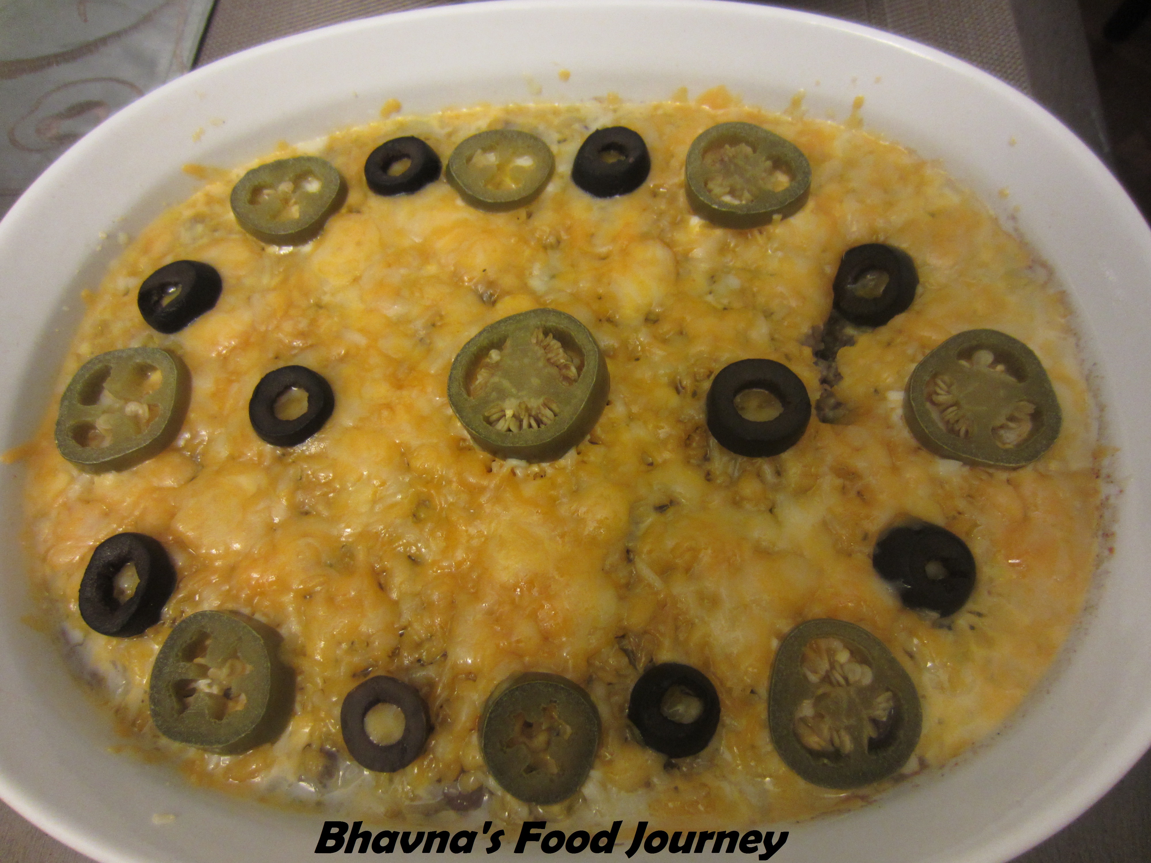 A very healthy, high in protein and tasty Mexican dip which is truly a crowd pleasure. Serve it with tortilla chips or warm naan. You can prepare this a day in advance and just broil the cheese on the top before serving it.