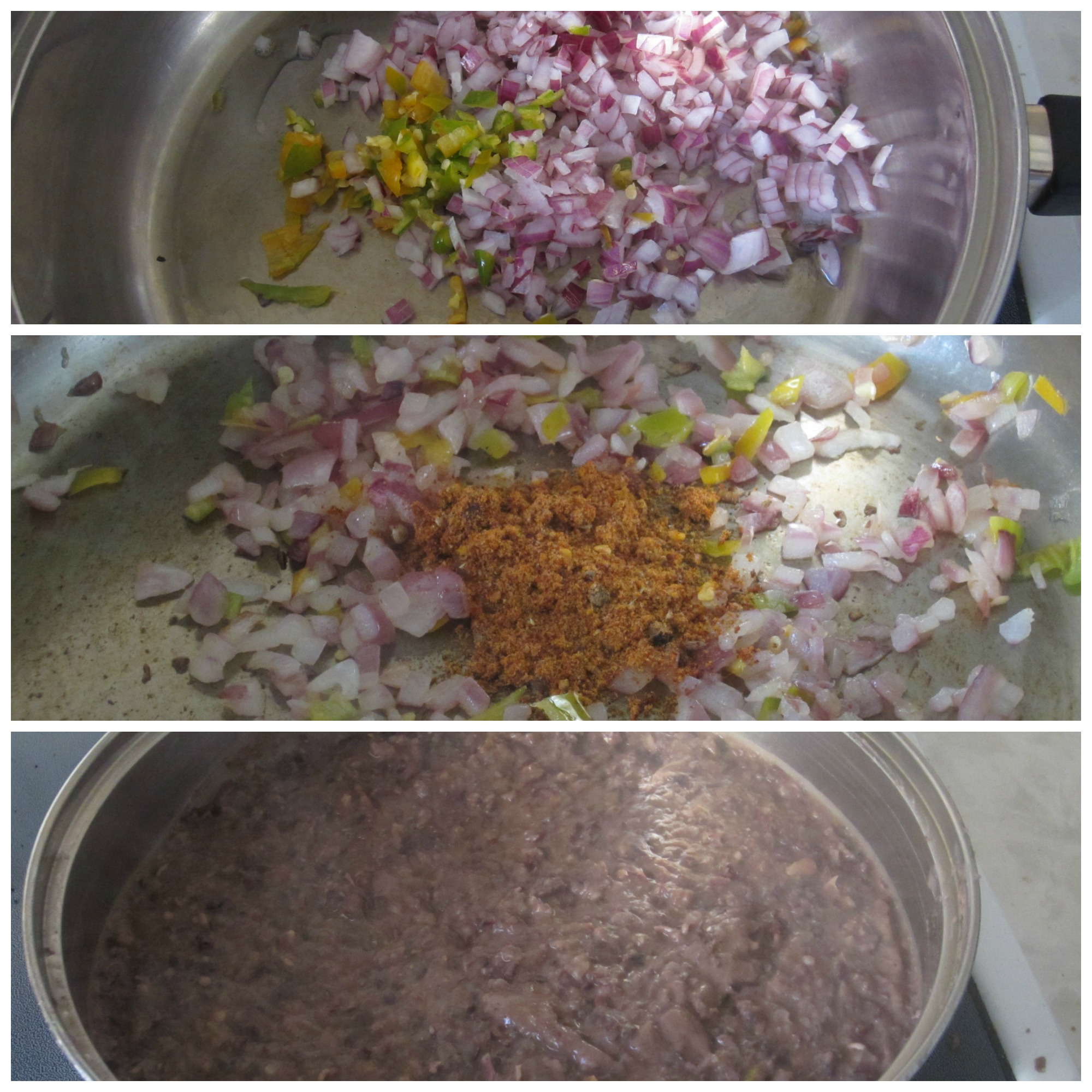 3. Heat 1-2 tsp of oil in a pan. Add finely chopped onion and green chilies. Saute for 1-2 minutes or until onions are translucent. Then add taco seasoning, saute for few seconds before adding bean paste and salt. Add about a cup of water so the bean paste consistency is not too thick or too runny. Bean soaks the lot of water so if you are going to keep this paste for later use then add more water to make it more softer. Cook for 3-4 minutes.