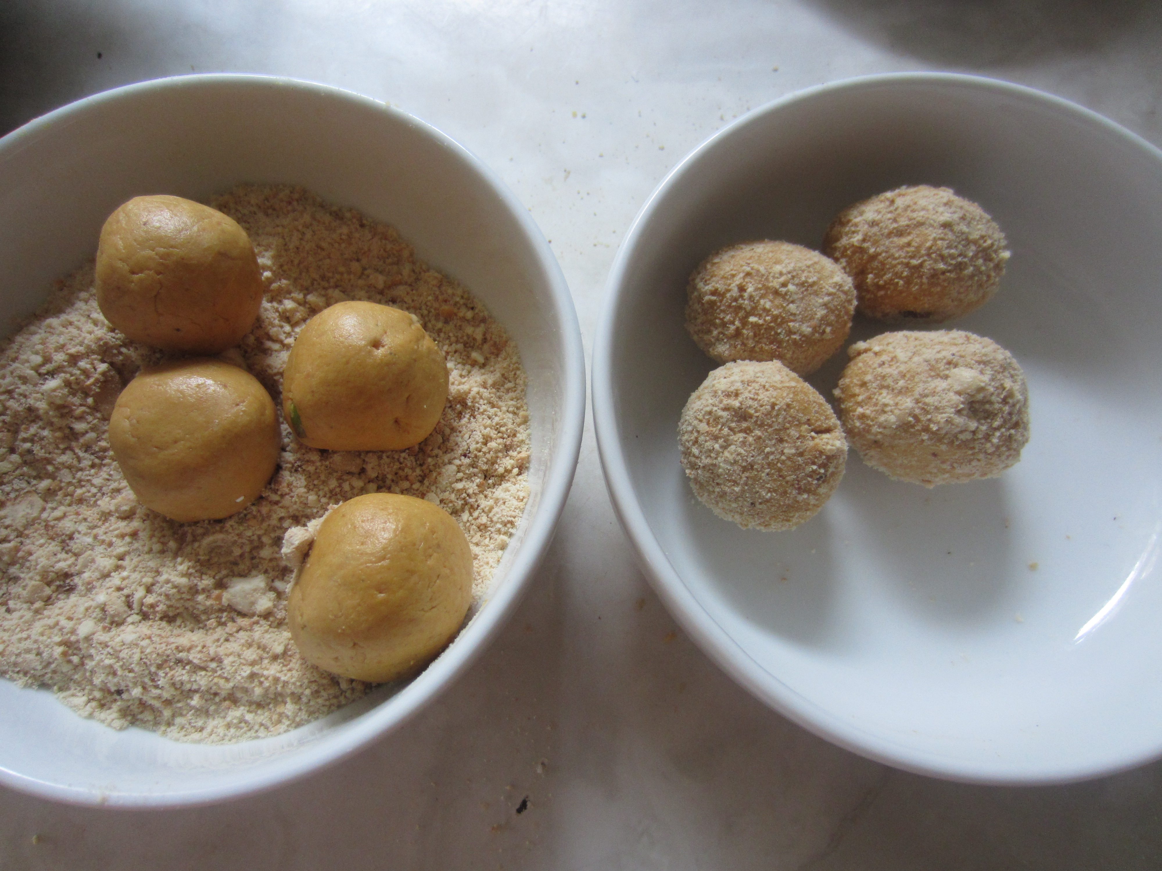 3. Roll small balls. Besan ladoo / Magaj is now ready. You can serve it like this or I rolled besan ladoo in roasted cashew powder.