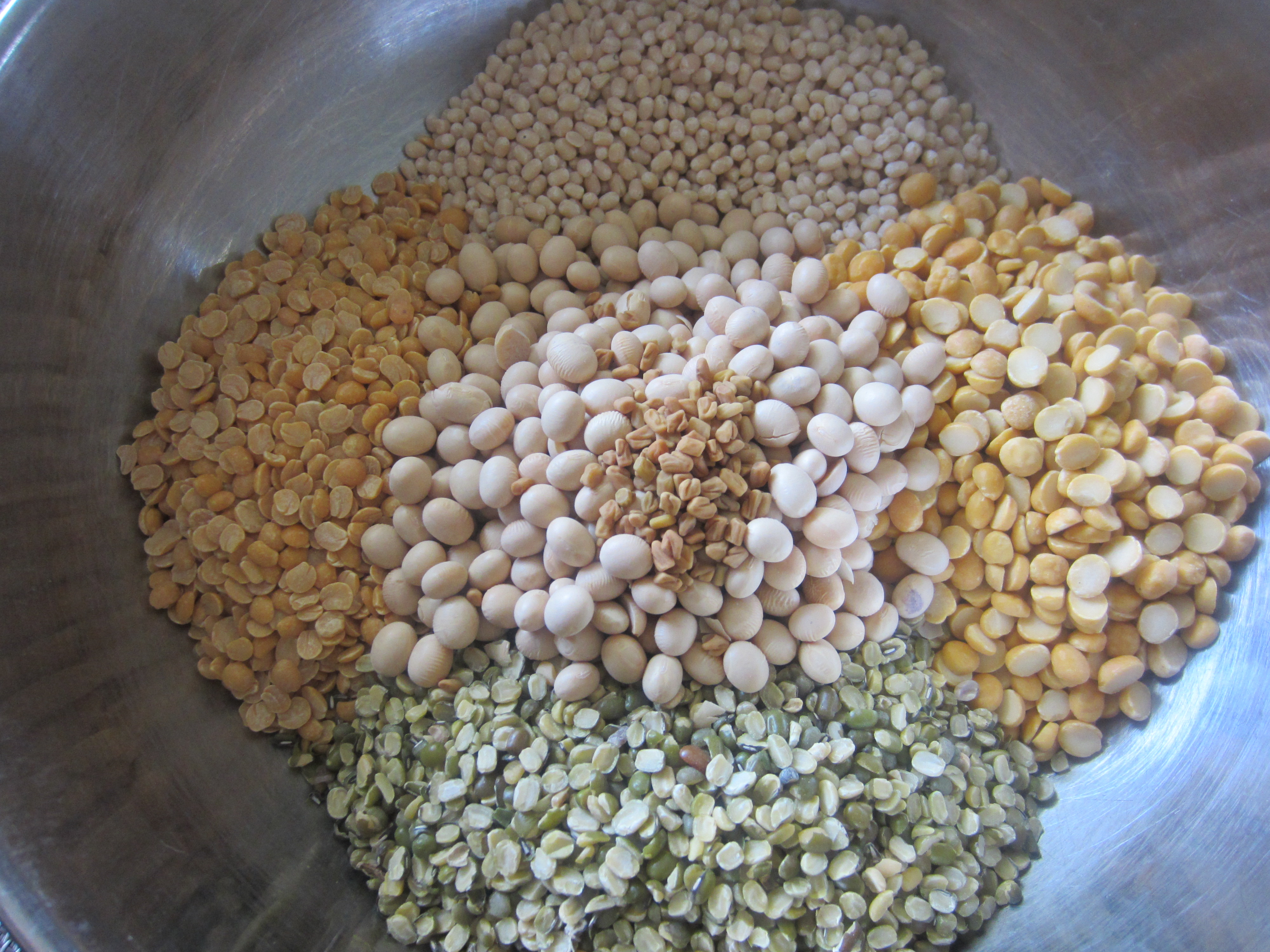 1. In a large bowl, wash all the dals, soy beans and fenugreek seeds with water a couple of times, and soak it in water for 3-4 hours. Once the dal is completely soaked, grind the mixture to a fine gradient using a mixer, keeping the amount of water used to grind minimal. Set this mixture aside for 3-4 hours.