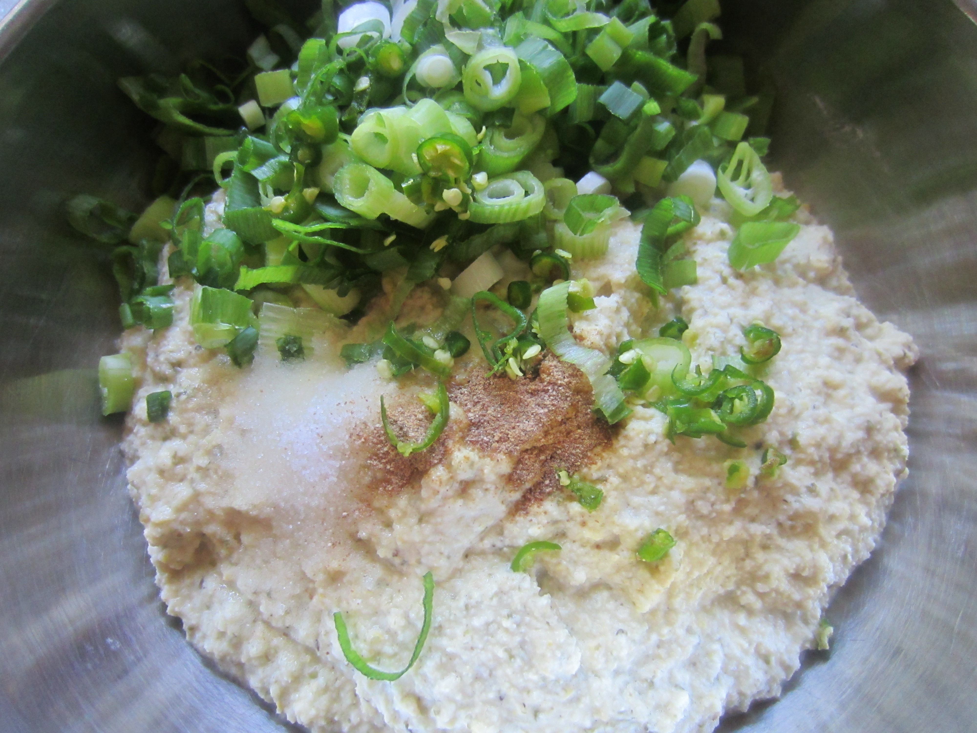 2. In fermented bean mixture, add chopped green chilies, chopped spring onion, black pepper, asafoetida and salt. Mix thoroughly.