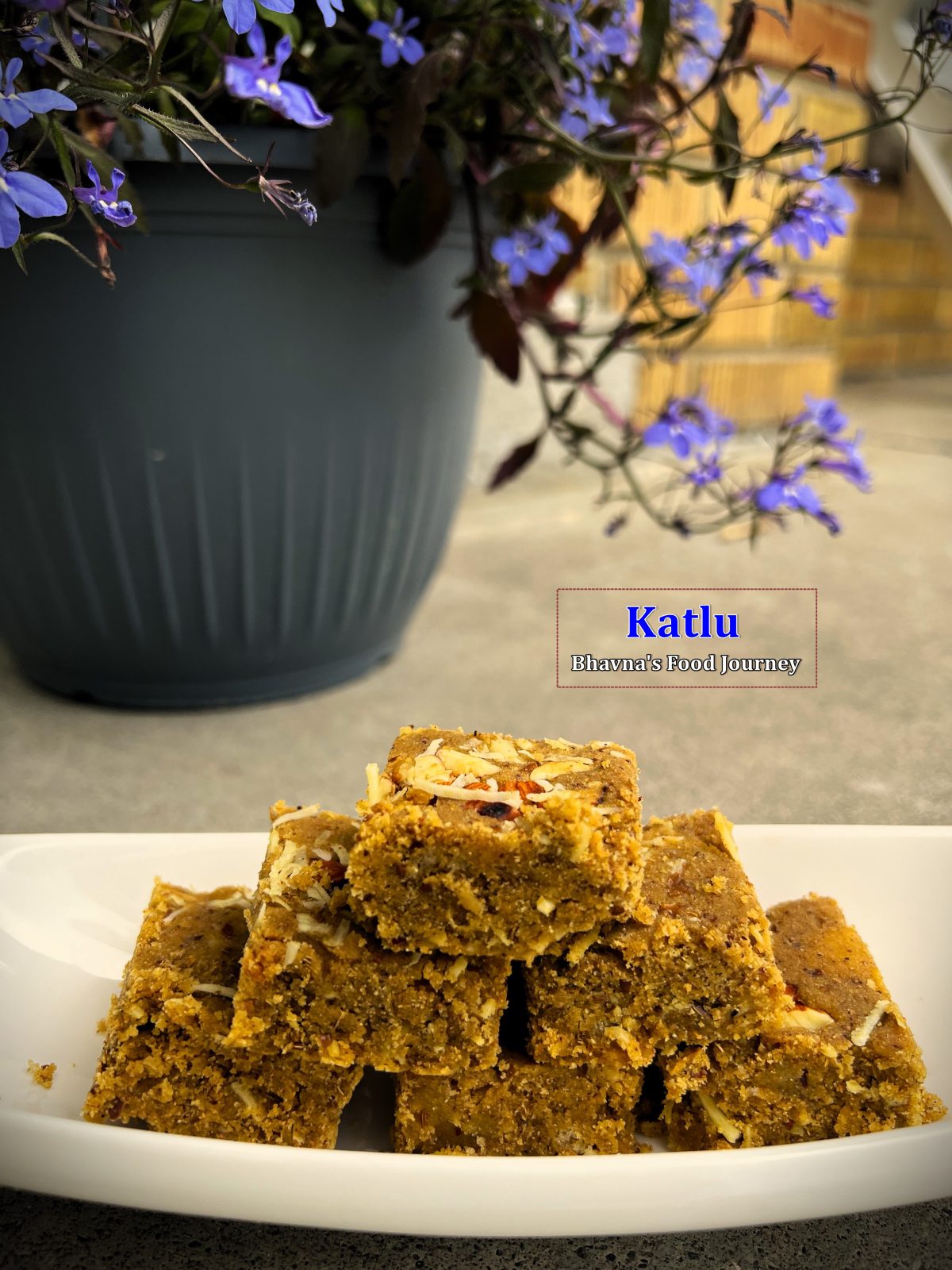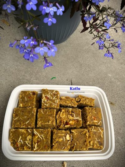 Katlu Pak has amazing health benefits and wonderful flavours from all the spices. It is so soft that it melts in your mouth. You can add poppy seeds, some fenugreek seeds and sesame seeds.  It is a very rich dish. Share with your family and friends so someone who needs it can benefit from it.