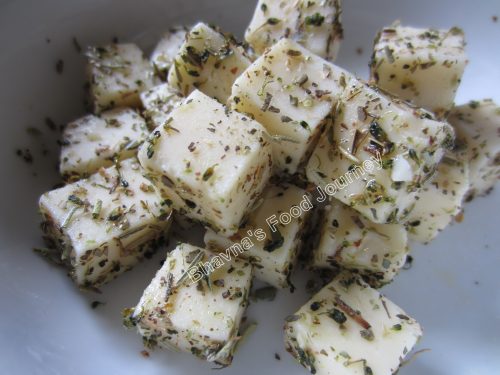 3. When dough doubles in size, prepare cheese for stuffing. In a bowl, mix cheese cubes, olive oil, oregano, basil and rosemary. Keep on side.