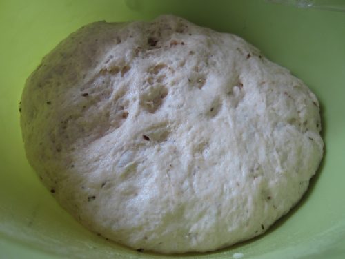 2. Mix all the ingredients for the dough (rub caraway seeds, oregano and rosemary between your palm before adding) including activated yeast and make soft dough with warm water. Knead the dough properly. Place the dough in a greased bowl, cover with plastic wrap and put it in a warm place to rise for 2-3 hours until dough doubles in size.