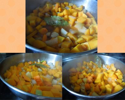 2. Heat 1 tbsp oil or butter in the pan. Add bay leaf and ginger. Then add all the veggies and salt. Cook on medium heat stirring frequently. When veggies start to change the colour or gets the brown mark (in 5-6 mins) add 1 glass water. Cook on medium heat with lid covered. It will take nearly 10 minutes to cook squash after you add water. Check squash with the tip of knife, when it is soft then turn off the heat.