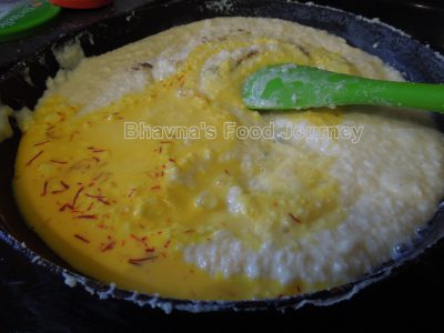 5. Then add saffron mixed with milk and cardamom powder to the mixture. Mix well.