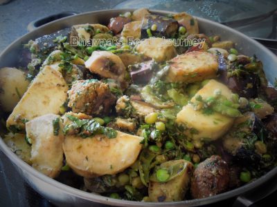 4. In a big non stick pan, add 4 tbsp oil. Add potato and sauté on medium heat stirring frequently. When potatoes are cooks slightly and has brown marks remove and keep on side. Then in the same pan, add kand and sauté until slightly brown from all sides. Remove and keep on side. Add little more oil if needed in the pan and follow the same procedure with kand, stuffed eggplant and toovar papdi. It won’t take more than 3-4 minutes for each veggies. All the veggies except banana are now slightly cooked.