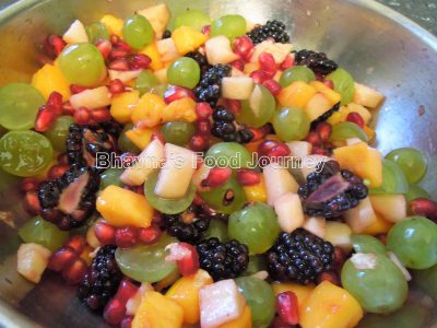 4. Chop apple and mango in small pieces, cut berries and grapes if needed. Mix all fruits in a bowl including pomegranate seeds. Add 1 tbsp icing sugar, mix well. Put this mixture in refrigerator until you are ready to assemble the glasses. You can use any fruit of your choice.