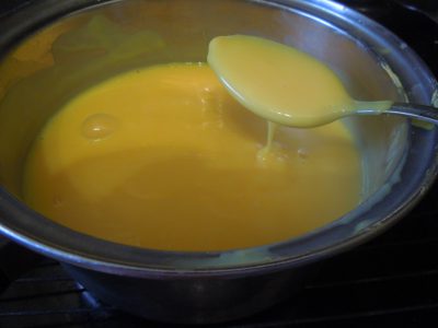 3. Heat milk in a pot. When milk is hot, turn down the heat. Now add custard powder slowly in the milk while stirring the milk with spatula using another hand. Also add 3 tbsp sugar. Cook on low to medium heat stirring continuous. We like desert with less sugar but feel free to add more if your family likes more sweet. When milk becomes thick and sticks to spatula, turn of the heat. Whisk it properly one more time. You can prepare this custard ahead of time and leave in refrigerator.