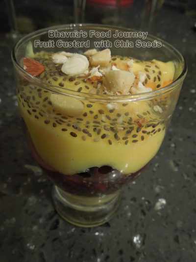 5. To serve this custard, I am using wine glasses. When ready to assemble, removed custard from the refrigerator and whisk it. If it’s too thick then add some milk and whisk again. Remove fruit bowl from the refrigerator. You will also need soaked chia seeds and chopped mixed nuts.