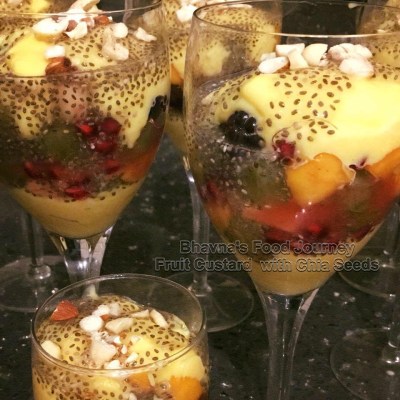6. Add a 1 tbsp custard in a wine glass. Add 1/7 of the fruit mixture. Add more custard on the top and chia seed mixture. Garnish with chopped nuts. Prepare all the glasses and keep in the refrigerator until time to serve.