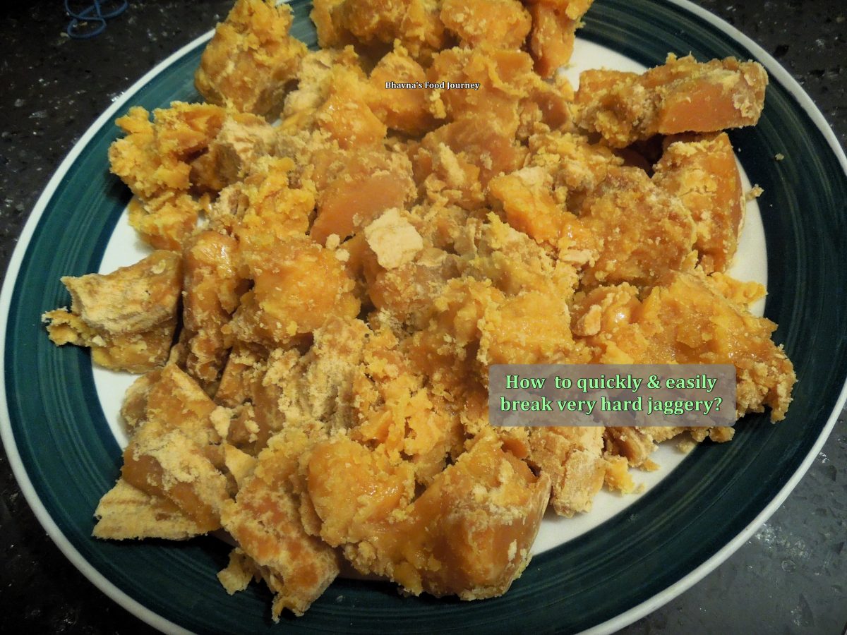 Remove jaggery from plastic wrap or container. Put in a microwave safe plate. Microwave it for around 20-50 seconds depending on the size of the block, yes you read it right! I first microwave for 15 seconds and then 20 seconds. I was cautious as I did not want it to melt. Then I used knife to break in big chunks and then with my hands I made the small pieces. And I was done. It took me less than 3 minutes from start to finish.