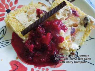 There is no cooking or baking involved to prepare this dessert except for the fruit compote. You can prepare this dessert way ahead and prepare compote on the day of the event. If you don’t have access to panettone, you can use raisin bread or sponge cake. You can use the ice cream of your choice. I used vanilla and cheese cake ice cream for 2 different layer. You can use seasonal fruits like chikoo, mango, orange, pear, berries, peach, etc. for layering and for the fruit compote. You can top with chocolate syrup instead of fruit compote. I am sure the end result will be divine! Here is how I prepared very easy delicious, orange flavoured dessert, topped with berry compote.