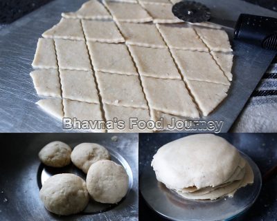 4. Roll like paratha and pile on top of each other. Cut one roti at a time in diamond shape using cutter or knife when ready to fry. If you don’t want it to puff during frying, then pock some wholes before frying.