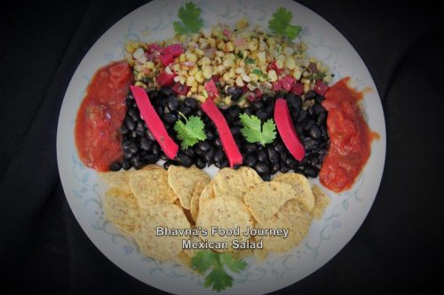 This simple and refreshing crunchy salad has all the flavours of Mexico. It is ready in no time and taste is amazing. I put together this salad in less than 5 minutes as I had frozen corn. I also had leftover black beans and store bought salsa.