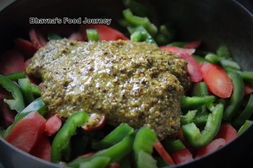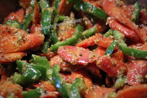 3. In clean bowl, mix slices of pepper and carrot with the masala paste. Mix well. Add more oil, adjust the salt if needed.