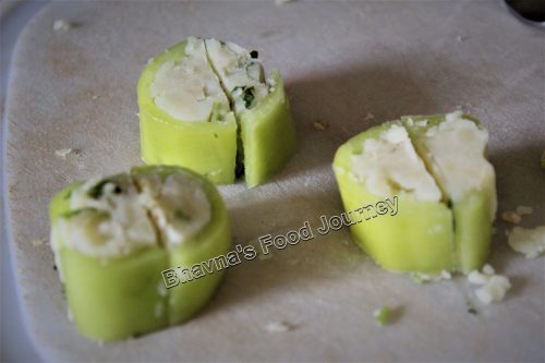 5. Everything is ready. Fill each chili pepper with potato stuffing. Cut these stuffed chilies in to 1 inch thick circle which can fit in appe pan.