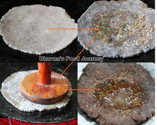 2.When you are ready to prepare paratha, kneed the dough one more time. Heat a cast iron pan on medium heat. Make a slightly bigger ball of down, roll using rolling pin. Sprinkle some sesame seeds on top while rolling so it sticks to the surface. You need to use the dry flour to roll dough into roti/paratha. If it sticks to the surface, you can rub little oil and roll it. Make a slightly thick paratha.
