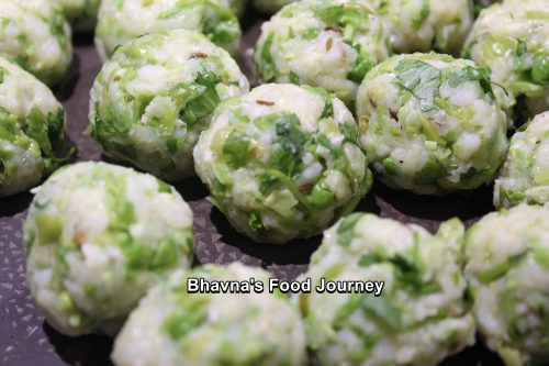 4. Mix green mixture with mashed potato, add coriander leaves. Adjust salt and lemon juice at this point. Make desired size balls. I made balls which can fit in appam holes. If you are planning to deep fry then you can make slightly bigger or smaller balls.