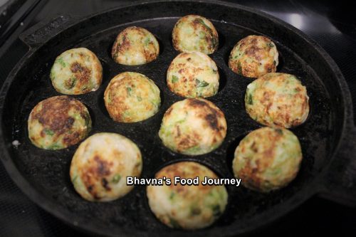 6. When you are ready to make patties, heat appam pan. Grease each hole with 2-3 drops of oil. When pan is hot, turn down the heat to medium. Dip each balls in arrow root batter, then drop one ball in each hole. You can add 1-2 drops of oil once while you are flipping the balls in pan. Cook from all sides until it’s brown. Remove from the pan when done. You can instead deep fry these patties in hot oil.