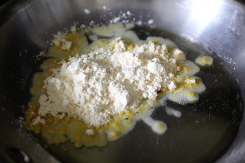 2. Heat 3 tbsp ghee in heavy bottom or non-stick pan. When ghee is hot, turn down the heat and add 2 tbsp besan. Cook besan stirring continuous on low heat until slightly brown and flavourful (2-3 mins).