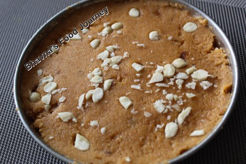 6. Spread the cooked barfi in a greased pan/thali. Top it with chopped almond. Keep it in refrigerator for at least an hour before making pieces.