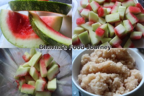 1. Remove pulp from watermelon. Use peeler to remove the top skin from the rind. Try peeling 2-3 layer of skin as it is very hard. Cut in cubes and make a paste using mixer grinder.