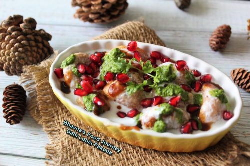 Have you ever tried making pakoda using lobia? Recently, I learned that black eye bean (lobia or chola in Gujarati) has a very high foaming value. So instantly I started thinking what can I use it for. There were few recipe idea came into my mind. This is one of them. I was so surprise that the batter was so light and frothy. I have never used it this way before so I found my new love for lobia. It is also known as goat pea or California Black eye. It is a great source of iron and protein. I tried both method deep frying and cooking in appam pan with very little oil and I did not find any difference in the taste, so no more frying this pakoda. I did not add any baking soda but pakoda were so light and spongy, soft from inside and crunchy outer layer. I think this is one of my new favourite dish. I served it like dahi vada, but you can serve it with sambhar, rasam, chutney, anyway you like. It was absolutely divine! Dahi pakoda is super-delicious and it’s easy to get the kids to eat it too! The flavour of crushed coriander and fresh methi makes it super inviting. Try it for yourself!