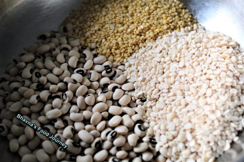 1. In a large bowl, wash lobia, moong dal and urad dal with water a couple of times, add methi seeds and soak it in water for 5-6 hours. Once the dal size has doubled, grind the mixture to a fine gradient using a mixer, keeping the amount of water used to grind minimal. Remove it to big bowl. Whisk the mixture with clean had for 1-2 minutes. Set it aside for 1 hour.