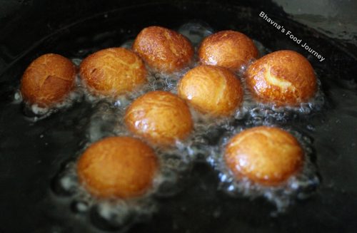 3. While sugar syrup is in making, heat frying pan with some oil. When oil medium hot, add 7-8 jamun balls. Very lightly and carefully stir continuous using spatula while frying or it will burn the jamun from one side. When jamun are nice brown from all sides, remove from frying pan and add to hot sugar syrup directly. Fry all jamun in few batches and add them to syrup immediately.