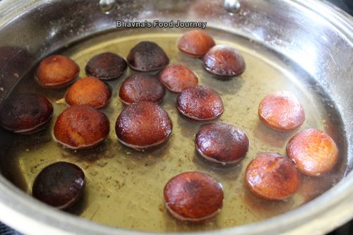 4. You will see jamun will start soaking the syrup, it will double in size in just couple minutes and it will be juice. You can carefully transfer this to container. You can serve it hot, at room temperature or cold as per your taste. You can keep them in fridge for couple days.