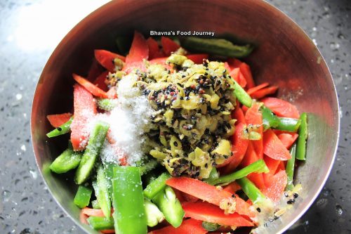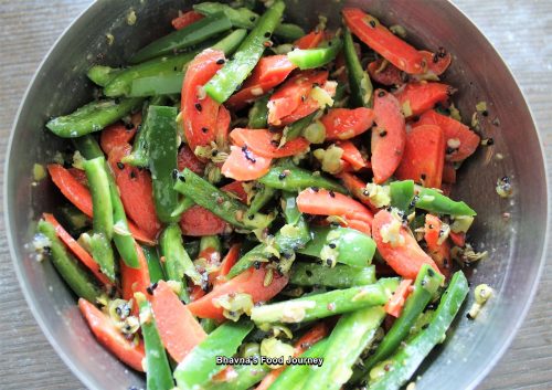 3. In clean bowl, mix slices of pepper and carrot with the masala paste. Mix well. Add more oil and salt if needed.