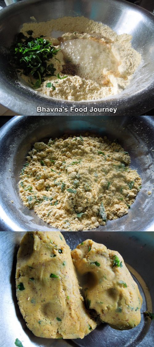 1. In a mixing bowl, add besan, chopped fenugreek leaves, ajwain (optional), turmeric and chili powder and salt. Make a well in the flour and then add 1 tbsp hot (boiling) ghee. Mix it will spoon first. Then using hands make slightly hard dough adding little water at a time. Let the dough rest for 30 minutes covering the lid.
