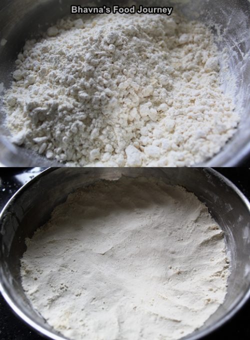 3. In a mixing bowl combine, urad flour, besan and milk ghee mixture. This step is called dhabo. Mix everything using your hands and rub flour with palms. Then sieve this mixture and break the lumps with hands which sieving. Once it all done, just press the flour mixture with hands, cover with lid and let it rest for at least 30 minutes.