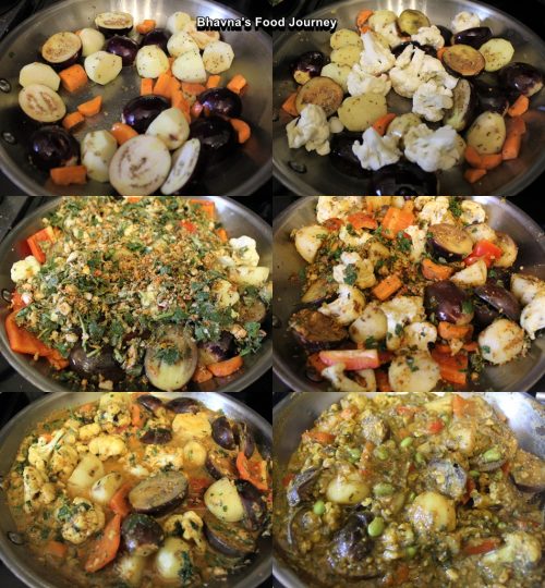 3. In a wide bottom pan, add 3 tbsp oil. Add ajwain seeds, smashed garlic and asafoetida. Sauté on low heat for 1 minute so oil gets the flavour of garlic and ajwain. Then add potato, eggplant and carrot. Sauté on high heat stirring continuous for 2-3 minutes. Then add cauliflower florets and continue to cook for 2 minutes. Then add pepper cubes and sauté on high heat for 1 more minute. Now lower the heat to medium and add masala mix. Stir everything and mix well. Saute for 1 minute veggies with masala. You can add this to pressure cooker, add 1 cup of water and cook on medium to high heat for 1-2 whistle to speed up the process. OR continue to cook in the same pan. Then add around 1½ cup of water. Mix well. Cook on low to medium heat for 20-25 minutes stirring occasionally. During this time you can add green peas or any kinds of fresh beans. Check if water dries out then add 1/2 cup water. Make sure it doesn’t stick to the bottom of the pan. Cook until veggies are slightly soft and you can easy press knife in it. Turn off the heat. This slow cooking process helps to develop the flavours. While it is cooking, you will start feeling hungry because of all the flavours in the air…lol.