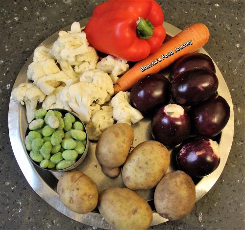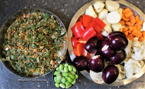 No time to make undhiyu, make this. As much as I love undhiyu, it is not always easy to prepare it last minute. You need to plan ahead when you wanted cook traditional Gujarati undhiyu. It takes time to make muthia and stuffing all veggies. This time I planned this last minute as I had few left over veggies lying around in my fridge. While talking to my husband, I said “why can’t I put pepper (capsicum), cauliflower, carrot in my undhiyu?”. My husband started laughing, he knew I was up to something 😅😉. He said why don’t you prepare what you are thinking. So next morning, I put on my chef’s cap and decided to try this veg curry. It was so delicious and not much preplanning. We both absolutely loved it! It was busting with flavours and super tasty. Every bite was so yummy! So next time if you have few veggies lying around, do try this dish.