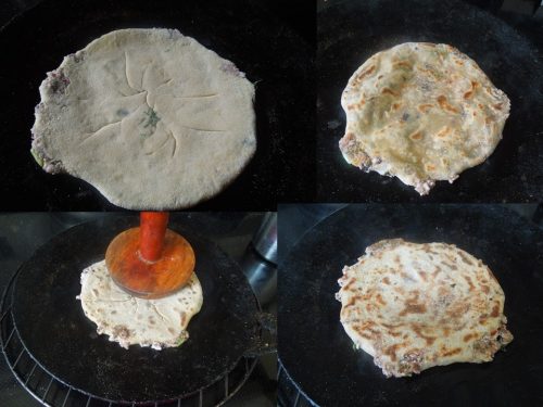 4. Heat non-stick pan/tawa and spread little oil. Keep heat to medium. Add the paratha on hot pan, smooth side below. In a 1/2 minute flip it and let it cook on the other side. Spread 1 tsp of ghee on upper side and flip it again and cook pressing lightly with flat spatula.