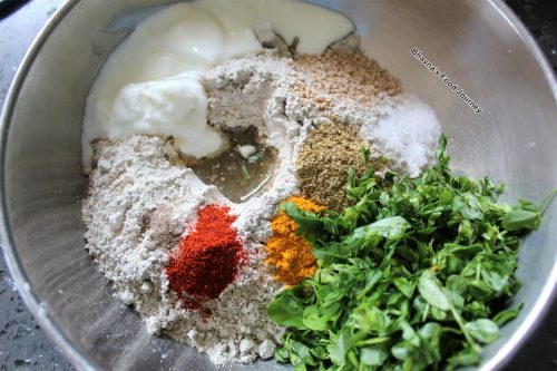 1. Prepare semi soft dough using bajri and oat flour, chopped methi, sesame seeds (keep 1 tbsp on side), coriander powder, chili powder, turmeric powder, asafoetida, yogurt, salt and 2 tbsp oil. Mix everything well first and then add little water only if needed to make semi soft dough. Knead the dough properly. Cover the dough and let it rest for 10 mimutes.